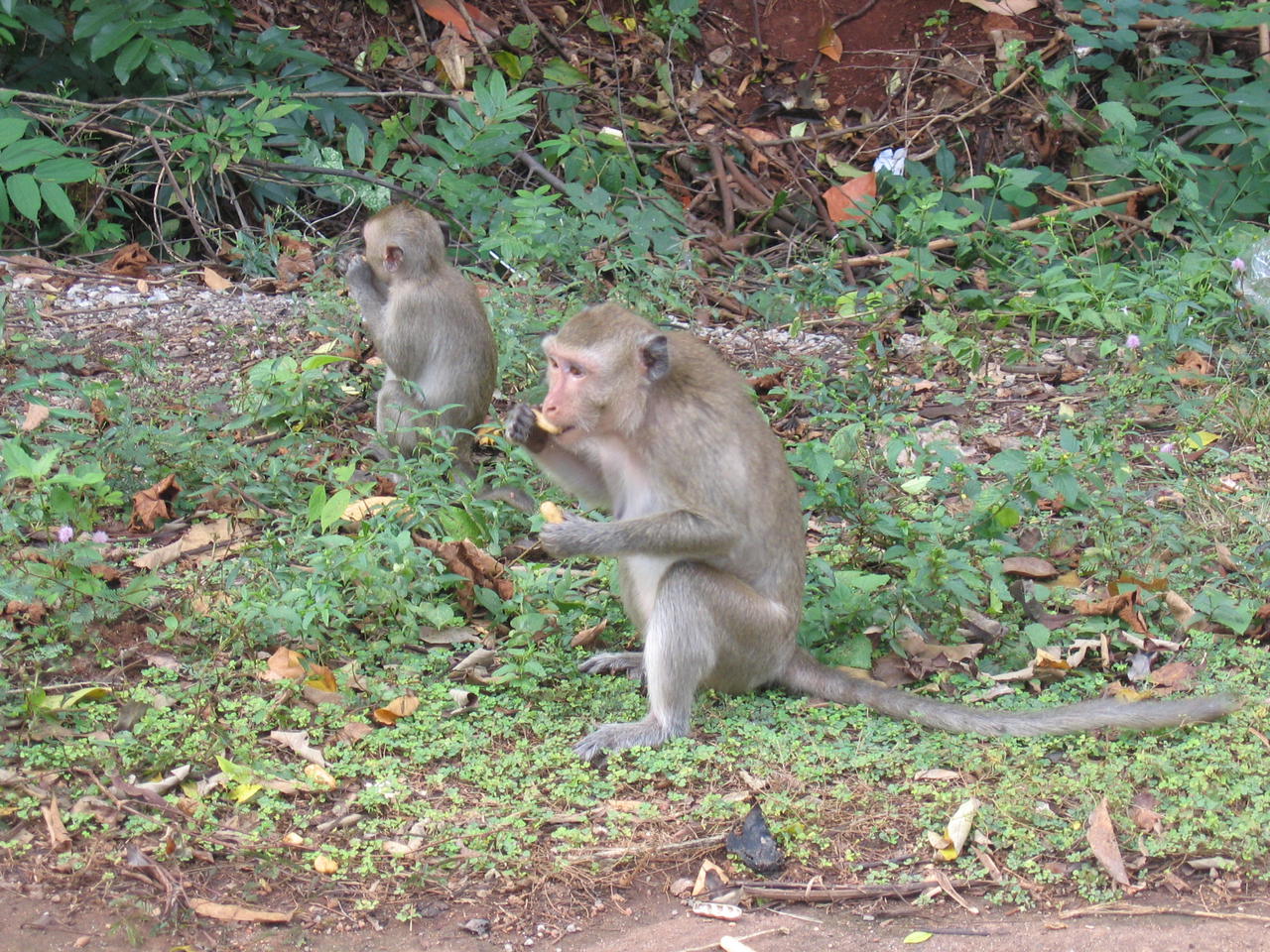 Nach einigen Stunden hatten wir genug gesehen und fuhren weiter Richtung Sai Yok Nationalpark. Und wie es der Zufall so wollte, trafen wir auf halber Strecke mitten an der Strasse auf eine wilde Affenbande von etwa 50 Tieren, welche sich breitwillig von vorbeifahrenden Touristen mit allerlei, leider nicht nur affengerechten, Nahrungsmittel versorgen liessen. Zwischen den Affen turnten auch noch ein paar Strassenhunde herum, welche sich wohl anbetracht der unerschoepflichen Futterauswahl auf eine Art Gentlemens Agreement geeinigt hatten.