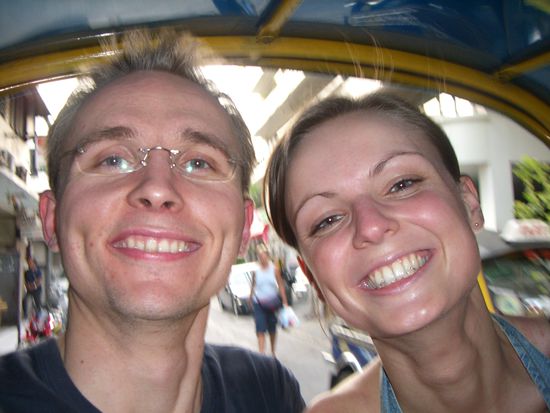 Silvester verbrachten wir auf der Khoa San Road. Die Thais feiern Silvester nicht mit einem Feuerwerk, sondern lassen viele bunte Luftballone steigen. Wir fanden in einer provisorischen Cocktailbar mitten auf der Khoa San Road Platz, und feierten mit einem "very strong Cocktail" ins Jahr 2008. Mitten unter groellenden Inselmenschen (= Englaender) rutschten wir wohlbehallten ins neue Jahr.