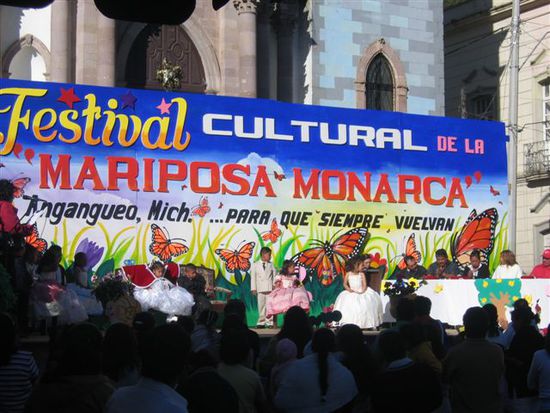 Jedes Jahr wird die Schmetterlings - Königin und Prinzesinnen gekrönt. Das halbe Dorf ist in Angangueo auf den Beinen um die Kinder bei ihren Darbietung zu bewundern.
