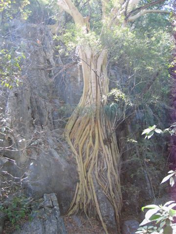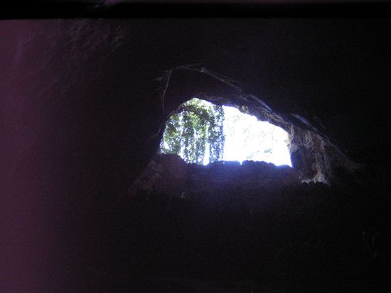 Der Eingang zur Höhle wird von imposanten Bäumen markiert.