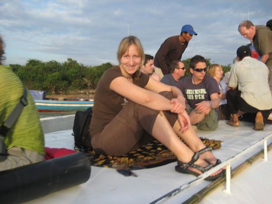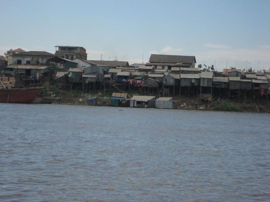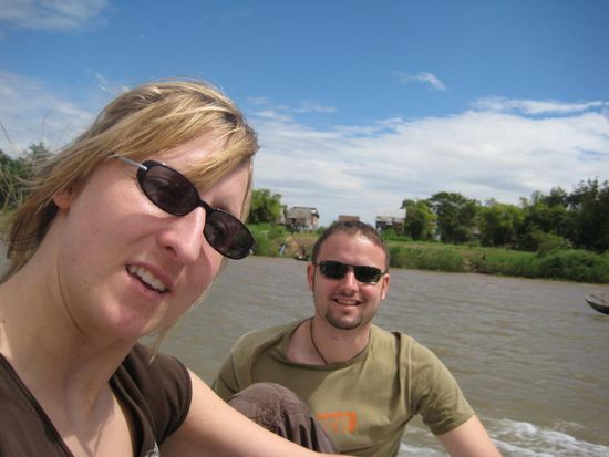 Also rauf aufs Boot. Sitztplaetze waren leider nicht genug vorhanden, da das Boot ueberbucht war. Das war allerdings nicht so schlimm, da es unten in der Kabine eh durch die Klimaanlage so kalt war, dass man es kaum aushalten konnte. Also setzten wir uns mit 20 Anderen aufs Dach der Passagierkabine. Als das Boot dann Fahrt aufnahm, merkten wir, das das auch nicht die ideale Loesung war,da es noch frueh am Morgen war, bewoelkt und immer wieder ein feiner Wasserstrahl ueber das Dach regnete. Nachdem wir auch dort ziemlich durchgefroren waren, sind wir doch unter Deck gegangen.So ging die Fahrt dann 3 Stunden Richtung Phnom Penh. Als draussen die Sonne durchkam, wollten wir dann raus um uns aufzuwaermen.Also wieder raus aufs Dach. Ich hatte mich schon im GH ein wenig mit Sonnencrem eingeschmiert,Melanie leider nicht. Durch den Fahrtwind merkte man die Sonne nicht und jetzt hat sie einen leichten Sonnenbrand sieht aber schon wieder ganz gut aus.