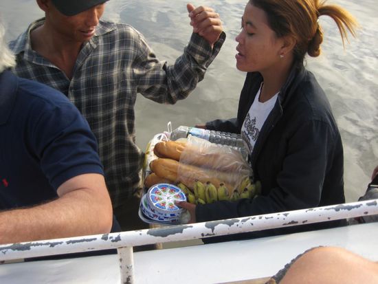 hier ist es nun 08:00 Uhr morgens,Melanie duscht noch und ich sitze in unserem GH am Computer. Nachdem wir gestern um 05:15 Uhr aufgestanden sind, das Moskitonetz und den Rest unserer Klamotten eingepackt haben,standen wir um 05:45 Uhr vor einem verschlossenem Tor.Erst nach genauem hinsehen sahen wir,das auf einer Liege im Innenhof,eingepackt in einem Moskitonetz und eingewickelt in einen Schlafsack ein Nachtwaechter schlief.Nach vorsichtigen Weckversuchen wachte er schlagartig auf und oeffnete uns die Tuer.Der Tuk Tuk Fahrer, mit dem wir am Vortag verabredet haben, dass er uns zum Busbahnhof faehrt, war leider nicht da. Das lag wohl daran das wir ihn am Vorabend um 23:00 Uhr noch volltrunken vor unserem GH gesehen haben. Naja es waren genug Andere da, die sich ueber die erste Fahrt des Tages freuten. Nachdem uns ein Angestellter des Reisebueros zum nahegelegenen Busbahnhof gebracht hat, mussten wir dort noch ca.20 Minuten warten, bis der Bus kam. Dann haben wir noch andere Leute an verschiedenen GH abgeholt und sind zum "Hafen" gefahren. Dieser befand sich in einem ziemlich aermlichem Dorf am See, welches aus sehr primitiven Holzhuetten bestand.