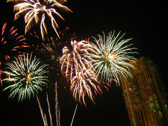 Nachdem Ich (Melanie) mir noch eine kurze Fussrefelxzonenmassage und Markus sich eine Rueckenmassage gegoennt haben, sind wir dann zu dem Entschluss gekommen am Fluss zu feiern. Also rein in das Taxi-wie immer verhandeln- und ab in die City. Am Pier des Oriental angekommen, herrschte gaehnende Leere. Na super. Doch kein so toller Tip gewesen. Oder etwa doch? Es war ja auch erst 23 Uhr unserer Zeit. Nach und nach kamen dann die ersten Schaulustigen. Wir standen also mit ca. 20 wildfremden Leuten am Pier ,mit komischen Hueten auf und haben uns eins der besten Feuerwerke angeschaut, die ich jemals gesehen habe.