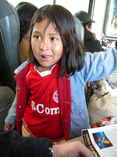 Da warens nur noch zwei. Stefan und Christian sind mittlerweile wieder im kuscheligen, 6 Grad warmen Deutschland angekommen. Alles Gute zum Geburtstag Steini!!! Wir zwei Pappkameraden haben uns entschlossen ueber den Salkantay-trek MachuPicchu zu erreichen. Neben dem Inka-trail ist dieser der lanschaftlich reizvollste und und fuehrt 5 Tage lang ueber alte Hauptwege der Inka durch die Anden. Einige Dutzend Reisebueros in Chusco versuchen dem Traveler das Maximum aus dem Geldbeutel zu ziehen. Wenn mann sie mit den Angeboten der Konkurenz konfrontiert hat man den Preis recht schnell von urspruenglich 300 $ auf 160 $ runtergehandelt. Montags gegen 4 Uhr gings dann fuer uns ans Eingemachte. Vom Taxi abgeholt gehts erstmal zum Busbahnhof. Dort trudeln dann auch nach und nach die anderen Teilnehmer des Treks ein. 22 an der Zahl, die auf 2 Fuehrer verteilt wurden, 6 Deutsche, 3 Spanier, 2 Hawaihaner, 2 Australier, 2 Mexikaner und jeweils einer aus Oestereich, Schweden, Norwegen, Canada, Brasilien und Ecuador. Dieser bunte Haufen sollte 5 Tage und Naechte jede Menge Spass haben(einige auch noch danach in Cusco und spaeter sicher auch noch in La Paz) und jede Menge Schweiss verlieren. Wie wir uns schon gedacht hatten sind die Buchungen der verschiedenen Agenturen in einen Topf geschmissen worden. So war der Brasilianer mit 140$ unser Schnaeppchenjaeger und eine deutsche Stewardes musste stolze 340$ berappen(mal eben gleich in Lima am Flughafen gebucht). Alle rein in den Bus, das Gepaeck oben drauf, die Lebensmittel fuer die naechsten Tage, tot oder lebendig auch noch irgendwie rein und ab gehts fuer drei Stunden richtung Mollepata(ein Bergdorf auf etwa 3000m Hoehe). Unter den Insassen waren einige Einheimische wie dieser eingefleischte Bayernfan