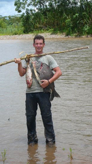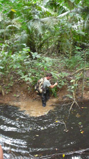 Nach dem Mittag folgt der erste Gang in den Busch, Many meint fuer uns Gringos sollten drei Stunden reichen(und Recht hatt er). Ohne Machete geht garnichts. Meine Orientierung geht nach 2 Min. verloren. Immer wieder ueberqueren wir kleinere Lagunen, mitunter voller Piranias und ab und zu auch mal mit eigenem Krokodil. Der 1. Versuch einige Fischlein fuers Abendbrot zu fangen scheitert. Many faengt zwar eine kraeftige Wasserschildkroete, die ist aber wohl das Einzige was hier nicht auf dem Teller landet.
