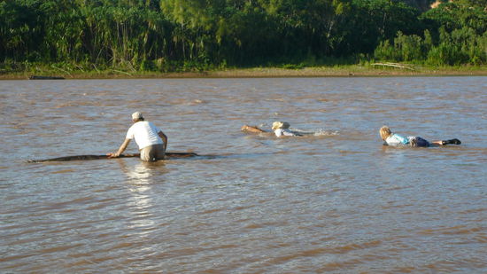 Voellig platt gings dann zurueck ins Camp. Selbst bei Stillstand setzt der Koerper mit der Schweissproduktion nicht aus. Erst am dritten Tag hat man sich drann gewoehnt. Fuer Erfrischung sorgt die Suche nach guten Fischgruenden. Ohne jegliche Sicherheit ist die Stroeming zu stark. Mit einem Baumstamm gehts los. Schnell noch Wind-, und Stromversatz berechnet........mist, da wollt ich garnicht hin.