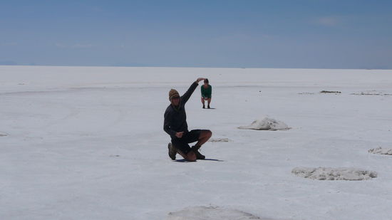Wir erreichen nach gut einer Stunde die Salar de Uyni. Ein riesiger, scheinbar nicht enden wollender Salzsee. Wir sind immer kurz unter oder ueber 4000m ueberm Meeresspiegel. Dieser Zipfel der Welt ist der mit den hoechsten Temperarurunterschieden(moegliche Differenz um die 100 Grad). Um diese Jahreszeit haelt sich das in Grenzen, tagsueber wird anstaendig geschwitzt(mittags) und nachts ein bisschen gezittert. Danke nochmal fuer den BW-Schlafsack, der hier endlich Sinn macht.