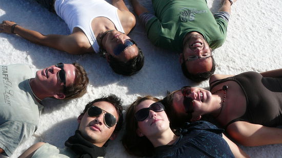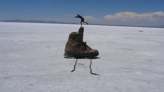 Meine Botten plaziere ich auf dem Balkon zum trocknen. Dann gehts ab zum Stadtbummel(10 min reichen). Einen Tag hab ich jetzt zum Trip durch die Salzseen buchen(mit Endziel Chile), Ausreisestempel und neues Bargeld holen, das Internet pflegen und mich nach neuen Tretern umsehen. Ich stelle schnell fest, das ich mich bei all dem nie zu weit von den Toiletten entfernen darf. Eine Stunde opfere ich der Jagd nach nem Turnschuh. Was richtig schoenes find ich nicht, meistens gibts nur die Groesse die auch in der Ayslage ist. Ich brech die Uebung ab als beim einzigen Schuh der nach was aussieht ploetzlich das Nikezeichen abfaellt(nichtmal der Kleber ist echt). Geld gibts wieder mal keins. Die Stadt hat nur einen Automaten fuer Visacards und der geht naruerlich nicht(Gott sei Dank am naechsten Morgen). Der Rest laeuft reibungslos, damit meine ich auch meine Toilettengaenge. Am naechsten Morgen treffe ich im Reisebuero meine Weggefaehrten fuer die naechsten drei Tage, ein Paerchen aus Constanz, Silke und Alex, und drei junge Leute(18) aus Bolivien und den Staaten, Jorge, Alex und Dana. Und los gehts in einem alten Toyota Landcruiser.