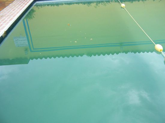 Doch jetzt der nächste Schreck. Das Wasser ist so trüb geworden, dass man die Fliesen in 70 cm Tiefe nicht mehr sehen kann. Lt. Sigrid war gestern Stromausfall. Die Pumpe ging nicht, noch dazu regnete es stark und das Regenwasser floss in den Pool. Es wäre aber genug Chlor im Becken, das Trübe mache doch nichts. Mag ja sein, dass genug Chlor drin ist...