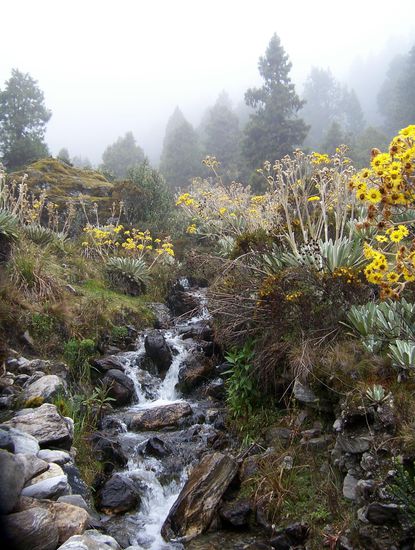 Wir sehen auf dem Weg einige Gemüseplantagen, viel Anden-Edelweiss (bis zu 3 Meter hoch), aber leider nur wenige Gipfel, da sich alle Berge in Wolken hüllen. So fällt auch der Rundumblick vom Pass leider wenig spektakulär aus.