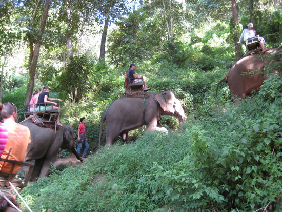 So! Montag standen noch 2 Events auf der Liste. Zuerst war das Elefantenreiten dran. Eigentlich wollten wir das nicht tun es war aber im Paket mit drin. Nach der ganzen Geschichte wussten wir auch warum wir zuerst nicht wollten. Die Elefanten mussten uns einen schmalen Weg den Berg hinauf tragen. Wenn sie stehen geblieben sind wurden sie immer wieder von den Fuehrern geschlagen bzw. mit einer Zwille beschossen. Nicht wirklich schoen! Wir kamen zwischendurch an einem Hochsitz vorbei an dem Bananen zum Fuettern verkauft wurden. Das war ein typisches Touri-Programm!