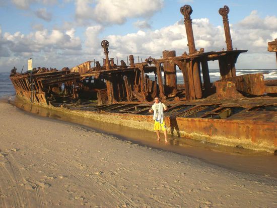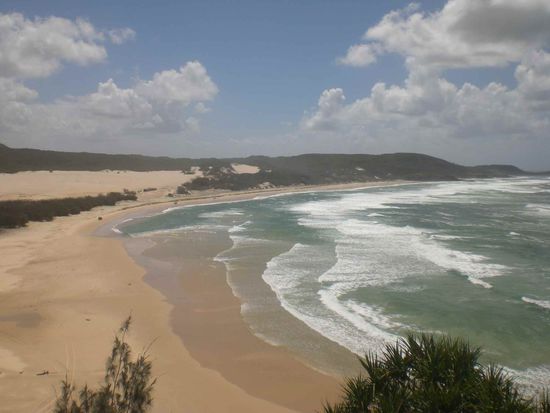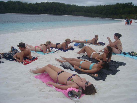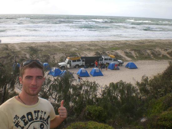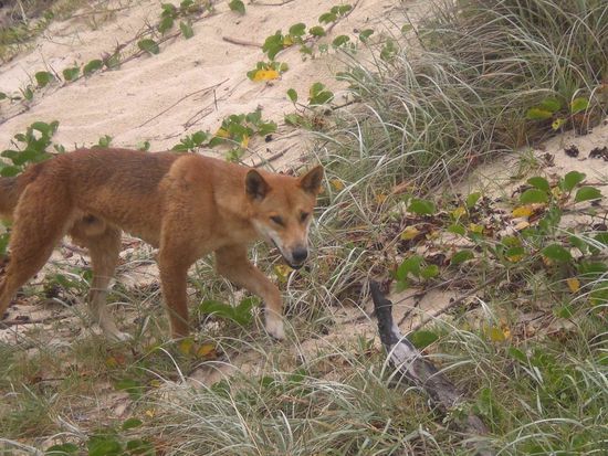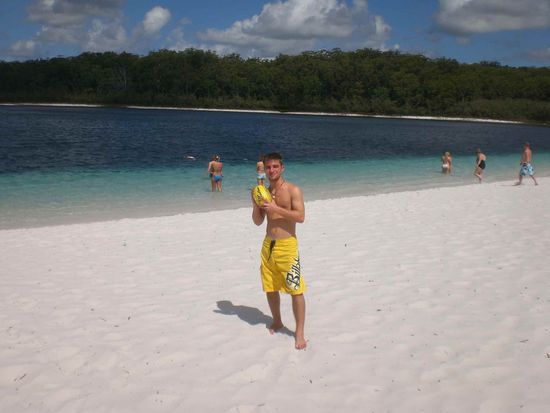 Nachdem Justus und ich uns getrennt hatten, haben wir beide nacheinander in unterschiedlichen Gruppen die schon lange vorher gebuchte Fraser Tour gemacht. Da man auf Fraser so ziemlich die gleichen Dinge erlebt fasse ich mal für beide zusammen.Bevor wir auf die größte Sandinsel der Welt per Autofähre gefahren sind, wird man im Dingos, das ist das Hostel das wir bei der Tourbuchung mit gebucht haben, in 5 oder 6 Gruppen je nach Anzahl der Teilnehmer eingeteilt.Jede Gruppe besteht aus 11 Leuten da dies die Vorgegebene Anzahl für den Jeep ist, 3 sitzen vorne und der rest hinten auf 2 gegenüberliegenden Bänken. Dann noch ein paar Regeln was das Verhalten auf der Insel angeht und los gehts. Die Fahrt zur Fähre sind ca. 5 Minuten und dann auch nur noch ca. 10 Minuten auf der Fähre und schon ist man am Ziel. Die meiste Zeit fährt man am Strand auf relativ hart gefahrenen Sand, wenn man aber zu dem Traumhaft schoenen Lake Mckenzie fährt muss man eine eher holperige Strecke in kauf nehmen wo es auch schonmal passieren kann das man in dem feinen Sand stecken bleibt. Doch es lohnt sich dieses kleine hinderniss zu überwinden da der Lake Mckenzie wie schon gesagt wunderschön ist. Das gute an dem See ist das es ein Süßwasser See ist und es auch nicht sooo schlimm ist wenn man mal ein Schlückchen nimmt. Dann gibt es da noch den Lake Wobby der eher eine weniger schöne Farbe als Lake Mckenzie hat, das besondere aber am Wobby ist , er ist auf einer Seite von Regenwald umgeben und auf der anderen Seite von "Wüste". Eine andere sehenwerte Sache auf Fraser ist der Indian Head, dies ist der höchste Punkt der Insel von dem man einen großen Teil der Insel sehen kann und auch nen tollen Ausblick aufs Meer hat.Die 2 Nächte auf Fraser verbringt man in Zelten. Die Verpflegung fuer den Fraser Aufenthalt bekommt man vorher von der Organisation bevor man los fährt.In den Jeeps ist alles vorhanden was man zum kochen braucht wie. zb. Gaskocher, Töpfe, Besteck usw. Das Essen ist ziemlich gut außer das man immer eine bißchen Sand mit dabei hat, das ist aber nicht zu verhindern da man ja auf der größten Sandinsel der Welt ist und durch den Wind kann das dann schonmal passieren. Abends sitzt man dann in der Gruppe oder mit anderen Gruppen zusammen und feiert das schöne Erlebniss auf Fraser. Man sollte aber immer Aufmerksam sein wegen den Dingos (siehe Foto), wovon es nicht gerade wenig auf der Insel gibt.Sie sind nunmal die Insel Hauptbewohner aber solange man den Dingos früh genug deutlich macht in dem man auf den Boden stampft und sagt: "go home dingo go home" , das sie unerwuenscht sind, ist alles in Ordnung und es passiert nix.Also ich wuerde jedem empfehlen der die Chance hat die Fraser Island Tour zu machen, dies zu tun!!!!!!!!