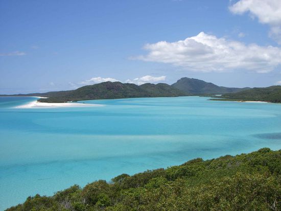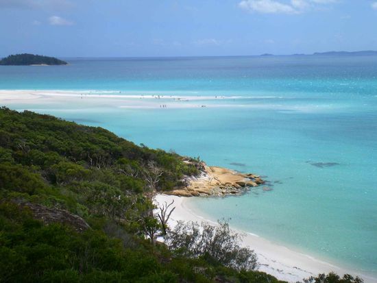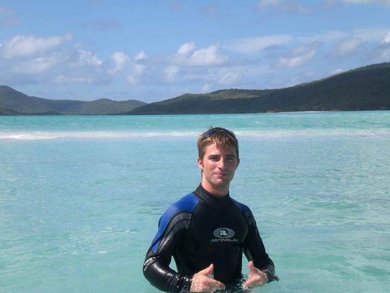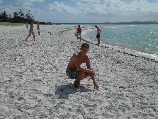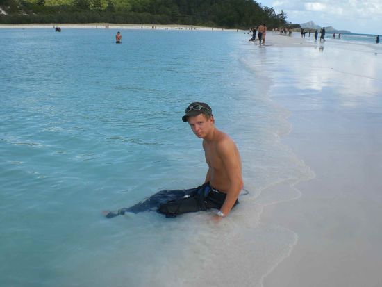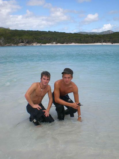 Man konnte eigentlich ganz gut schlafen nur dass es später immer sehr heiß wurde und dazu kam noch dass um 6 Uhr schon die Motoren angingen und man spätestens um 7 Uhr wach wurde. Kurz nach 7 gabs dann auch schon das Frühstück, was ich auch ganz gut fand damit man dann nicht den ganzen Tag verpennt. Das Essen war im großen und ganzen doch ziemlich gut. Es gab Frühstück, Mittag, Nachmittag und Abendessen was immer als Buffee gestaltet war. Sehr reichhaltig und man konnte sich immer Nachschlag holen. Morgens sind wir dann zum Whitehaven Beach gefahren, der einer der schönsten Strände der Welt sein soll. Angekommen an der Insel mussten wir erstmal nen kleinen Dschungelpfad meistern um dann zum Strand zu gelangen. Der Strand war beim ersten Blick schon überwältigend, strahlend weißer Sand und da wir die ersten waren, ganz verlassen. Stachelrochen und kleine Riffhaie waren rund um die Insel zu beobachten, sogar eine riesengroße Schildkröte haben wir vom Boot aus zu Gesicht bekommen. Nach dem Inselausflug ging es zu einem neuen Ziel, wo wir das erstemal dann schorcheln konnten. Unter Wasser konnte man jegliche Fischart bewundern, leider haben wirs nicht geschafft endlich mal nen Hai oder Schildkröte unter Wasser zu sehen. Naja man kann nicht alles haben... Abends wurde dann wieder was getrunken und am nächsten Mittag stand ja auch schon wieder die Heimreise an.