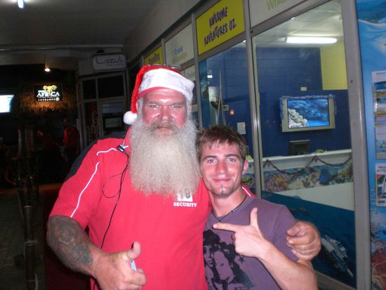 Zu Weihnachten haben wir uns alle für ein gemeinsames Barbeque an der Lagune, mit direkten Blick aufs Meer entschieden. Eingekauft haben wir reichlich, von Chicken über Kangaroo, Salat bis hin zu nem super Schoko-Kuchen für 1$ :O.. Tim und ich haben uns zur Feier des Tages dann eine Flasche Jim Beam gegönnt. Ist auch mal was anderes wenn man für knapp 1 1/2 Monate nur Bier(teuer) und Wein aus Plastiktüten trinkt (Goon ). Die Mädels haben von uns dann noch nen Weihnachtsbären mit Signatur mehr oder weniger als Abschiedsgeschenk bekommen, weil Sie auch nen paar Tage danach nach Brisbane weitergefahren sind. Der Abend endete wie auch viele andere im Mamas African. Eine relativ kleine Disco, die aber super House Musik spielt und all in all auch die beste Ausgehmöglichkeit in Airlie war, obwohl der Frauenanteil doch hoeher sein koennte.