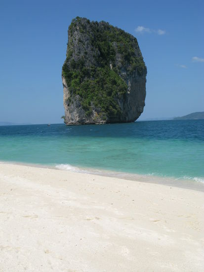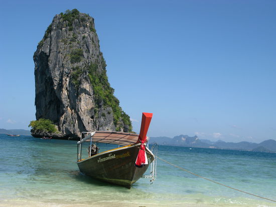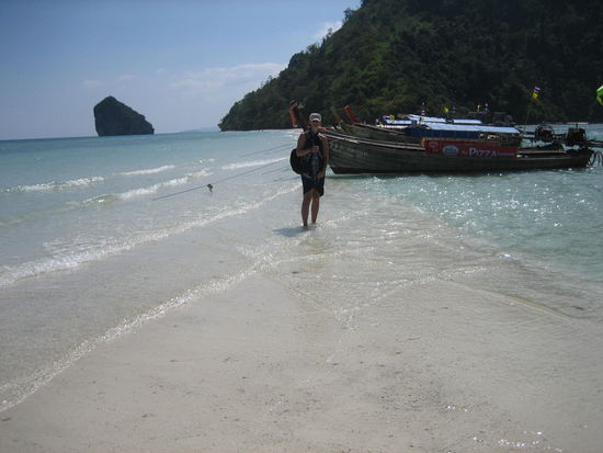 Fuer den naechsten Tag buchten wir die 4-Inseltour. Frueh morgens gings dann auch schon los. In einem Pickup wurden wir zum Pier von Ao Nang gebracht. Mit dem ohrenbetaeubenden Longtailboot fuhren wir zur ersten Insel, die sich "Poda Island" nennt. Am wunderschoenen Strand konnten wir uns sonnen, aber natuerlich auch im Meer baden & schnorcheln. Wir hatten ein wenig Toast dabei und fuetterten damit die Fische. Das war total lustig! So kann man mal sehen wie schnell Fische eigentlich sind. Danach schwommen sie die ganze Zeit neben uns her. Wir hatten eine Unterwasserkamera dabei, die wir schon beim Tauchen benutzt haben. Celo wollte die Fische in Pose bringen und ablichten; das Dumme war nur das der Film voll war. Nun gings mit dem Boot weiter zur "Chicken Island". Diese Insel wird so genannt, weil die Felsen wie ein Huhn aussehen. Wir legten nicht direkt am Strand an. Wer ins Wasser wollte musste direkt vom Boot hineinspringen. Dort konnten wir schnorcheln, was wieder total schoen war. Der dritte Stopp war auf "Tup Island". Dieser Strand gefiel uns besonders gut, da er durch eine Sandbank zwischen 2 Inseln verbunden ist. Hier war es wirklich traumhaft! Wir wollten fast nicht mehr gehen... Der letzte Halt war am Strand von "Pra Nang", wo die schoene Prinzessinenhoehle zu bestaunen war. Diese Kalksteinhoehlenbesichtigung war ein schoener Abschluss der Inseltour die sich echt gelohnt hat! Nun ging es wieder zurueck nach Ao Nang. Von dort aus wurden wir direkt zum Busbahnhof gebracht. Wir hatten naemlich nur noch wenig Zeit bis unser Bus nach Bangkok faehrt. Wir haben es dann aber zum Glueck geschafft; unser Bus verlies Krabi nur 10 Minuten spaeter...