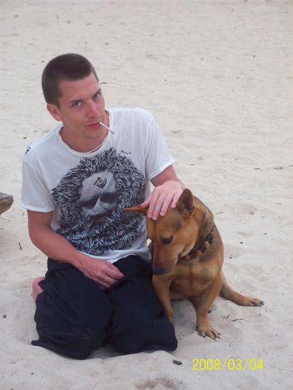fruehstueck bei uns am strand, mit "shortleg", der chrisy in diesem urlaub auch zu einem hunde-fan werden liess!