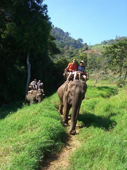 20.12. Der Norden Thailands ist bekannt dafuer, dass man sehr schoen in den Bergen trekken gehen kann. Um den Trip in die Berge etwas weniger langweilig zu machen, legen wir erstmal einen Stop in einem Elefantencamp ein, wo wir Elephant Riding machen. Nach meinen Erfahrungen aus dem Elephant Nature Park und dem Wissen, wie Elefanten gequaelt werden, um ihren Willen zu brechen und sie zu Sklaven zu machen, bin ich nicht grade begeistert davon, aber ok ...