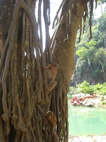 Erster Stop ist die "Monkey Cave", ein Tempel mit einer Hoehle dahinter. Da Buddhisten grundsaetzlich keinem Lebewesen etwas antun, hat sich eine ganze Affenkolonie hier eingefunden, die Narrenfreiheit haben ... und den Tempel und die ganze Gegend rundherum in Beschlag nehmen.
