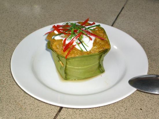 Fish-Amok mit Coconutmilk, Chili und Kefirblaettern als Dekoration ...