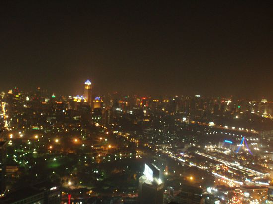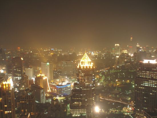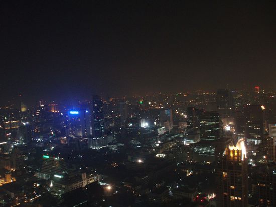 Mehr oder weniger zufällig traf ich in BKK die drei schwedischen Mädls wieder, die wir beim Dschungeltrekking in Chiang Mai kennengelernt hatten. Da die Drei am nächsten Tag Thailand gen Heimat verlassen werden, beschlossen wir zum Abschluss noch mal was Außergewöhnliches zu machen. Eine der drei Skandinavierinnen hatte eine Adresse einer gewissen "moon-bar" in Bangkok, die sich im 61. Stock befinden soll. Nach rund einstündiger Irrfahrt mit einem TukTuk durch Bangkok fanden wir dann endlich das Hotel mit "moon-bar" oben drauf. Alleine die Lobby und deren Ausstattung vermittelte uns, was uns ein Angestellter später bestätigte: Luxuriös und teuer. Unter $350 gibt's hier kein Zimmer.