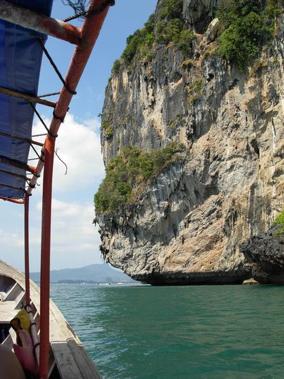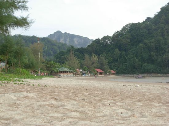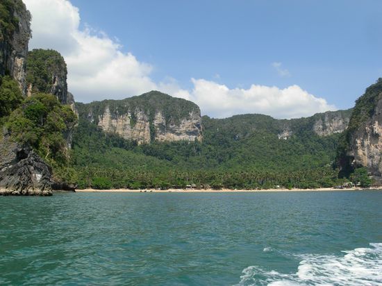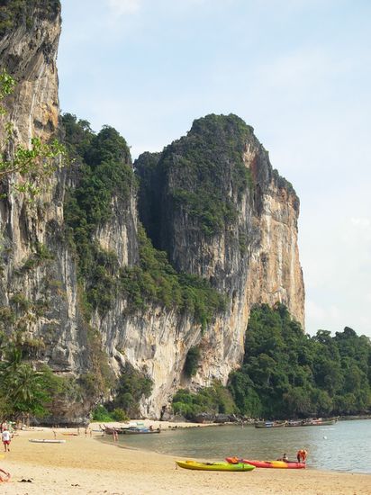 Vor drei Tagen bin ich dann vom Strand Ton Sai aufs "Festland" in den Ort Ao Nang übergewechselt, wobei auch "Ton Sai" theoretisch zum Festland gehört. Auf einer großen Halbinsel befinden sich nämlich mehrere Strände (einer davon ist Ton Sai), die aber nur vom Wasser aus erreichbar sind, da sich dem Landweg riesige Felswände in den Weg stellen und diesen so unpassierbar machen. Die zum Teil riesigen Felsen machen dieses Gebiet zu einem El Dorado für Kletterer aus der ganzen Welt.