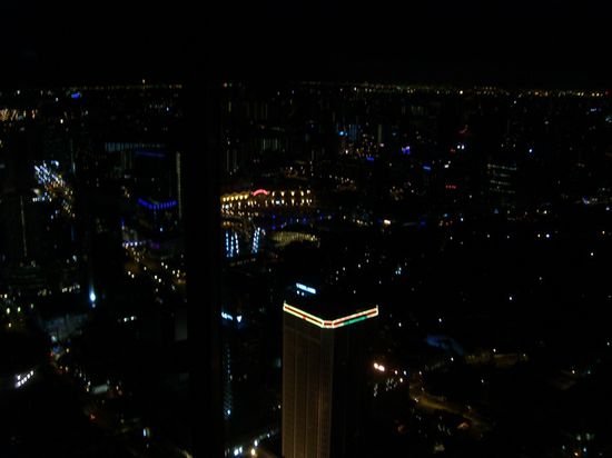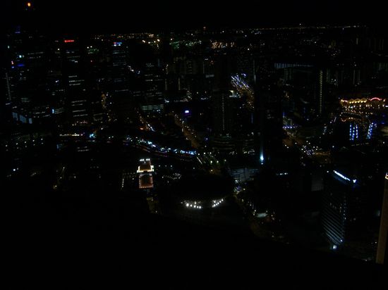 Vom knurrenden Magen gestresst und den doch recht saftigen Preisen entmutigt wandelten wir von Essenstand zu Essensstand, ehe wir (augenscheinlich) gutes Essen zu annehmbaren Konditionen fanden. Am Tisch platzgenommen bekamen Conny und Andi vor Neid fast Stilaugen auf das Essen unserer Tischnachbarn. Und in der Tat sah unser Essen im Vergleich zu Deren eher unterdurchschnittlich aus. Unsere beiden Tischnachbarn bekamen all das bestens mit - nicht zuletzt weil einer von ihnen Deutscher war und uns natürlich blendend verstand - und boten uns an, von ihren Tellern zu probieren. Da war das Eis praktisch gebrochen und man kam ins Gespräch. Jan und Vikram sind alte Arbeitskollegen, die sich nach Jahren zum ersten mal wieder sahen. Neben den lokalen Gerichten wurden wir von Vikram, der in Singapur lebt und auch hier geboren wurde und aufgewachsen ist, auch noch auf zum Teil undefinierbare aber leckere Fruchtsäfte eingeladen, die in Singapur sehr populär sein sollen. Damit aber noch nicht genug. Jans Idee war es, uns auf ein Dessert einzuladen. Da fast alle Restaurants in Chinatown aber bereits geschlossen hatten, wurde kurzerhand beschlossen, das Auto zu nehmen. Aus der Suche nach einem Dessert wurde dann eine gut einstündige Rundfahrt in Vikrams Auto, der uns so viel wie möglich von Singapur zeigen wollte. Beeindruckend, sich von einem Einheimischen die Stadt zeigen zu lassen. Was ich ja eigentlich schon seit meinem ersten Tag in Singapur tun wollte, wurde dann durch Vikrams Hilfe endlich wahr. Wir waren im 71. Stock des "Swissôtel - The Stamford" und hatten einen gigantischen Ausblick über Singapur. Was ich bereits vermutete und befürchtete bewahrheitete sich auch: Für das Restaurant und den Club herrschte ein Dresscode und der lautete leider nicht "kurze Hose und Flip-Flops". Dennoch hatten wir zumindest auf eine Seite einen tollen Ausblick und ergatterten ein paar tolle Bilder