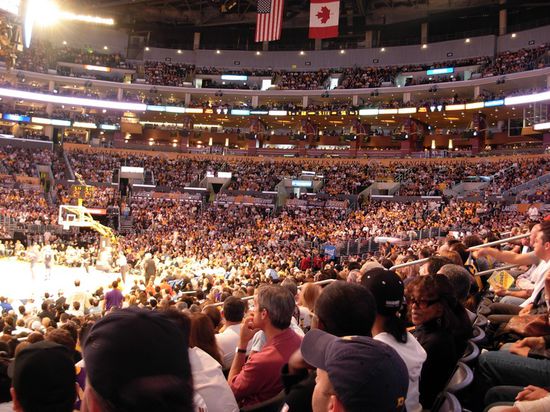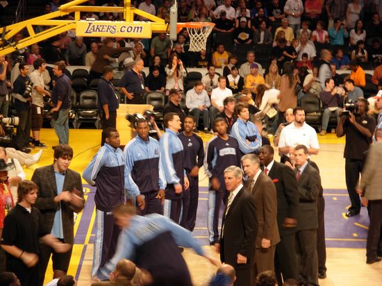 Gemütlich nach dem Frühstück machte ich mich also erneut auf zum Stapels Center. Dass das Spiel so gut wie ausverkauft sein würde, war klar. Immerhin waren wir schon in der zweiten Playoffrunde. Schnell habe ich erkannt, dass offizielle Resttickets der beiden niedrigsten Preiskategorien ($39 und $59) nicht mehr zu bekommen war. Ähnlich wie in Deutschland boomte auch hier der Schwarzmarkt. Von VIP-Tickets über Tickets direkt unten am Parkett bis hinzu offensichtlich gefälschten Tickets bekamen wir alles angeboten. Von $300 bis $1200 pro Ticket war alles dabei. Anders als in Deutschland war allerdings die Tatsache, dass hier die Scharen von Cops nicht nur da waren, um für Recht und Ordnung zu sorgen, sondern auch um den Schwarzmarkthandel zu unterbinden. Wie mir andere auf Tickets Wartende berichteten setzte das Los Angeles Police Department dazu sogar Undercoveragenten ein. Deswegen wurde mir durchaus ein bisschen mulmig, als ein weiterer junger Mann versuchte seine überzähligen Karten an mich und einen neben mir stehenden Typen zu verkaufen und wir schließlich einwilligten. Dieses Angebot konnten wir nicht ablehnen. Tickets, die im offiziellen Verkauf $300 kosteten wurden uns für $100 angeboten. Reihe fünfzehn hinter der Spielerbank der Gastmannschaft. Um auch sicherzugehen, dass das keine gefälschten Tickets waren, gingen wir also mit dem Typen zusammen ins Stapels Center. Und oh Wunder - ich war drin. Es hat funktioniert. Geldübergabe gabs dann kurz darauf und ich war erleichtert, dass wir <b>nicht</b> an einen Undercoveragenten geraten sind. Da Anthony (so hieß der Typen der mit mir gewartet hat und ebenfalls auf günstige Tickets wartete) und ich auf die Geduldstaktik setzten (je länger die Leute vor dem Stadion ihre Tickets nicht losbringen, desto nervöser werden sie und desto leichter lassen sie sich im Preis runterhandeln) kamen wir gerade zur Eröffnungszeremonie auf unsere Plätze. Bei jedem noch so kleinem Sportevent in den USA gehört die Nationalhymne zum Pflichtprogramm vor jedem Spiel. Auch hier wurde das natürlich äußert patriotisch zelebriert.