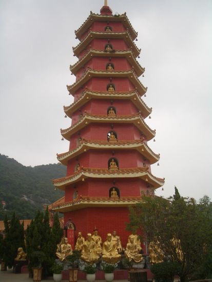 Wir fahren mit der Star Ferry nach Kowloon. Leider ist es (wie gestern) immer noch sehr diesig ... die Berge sind kaum zu sehen! Mit der KCR-East-Rail fahren wir bis Sha Tin. Nach kurzen Orientierungsschwierigkeiten finden wir dann auch den richtigen Weg und laufen zum Kloster der 10.000 Buddhas. Unterwegs kommen wir an einer Art Gemeindehaus (vielleicht wars auch ein nicht geschmückter Tempel ...) vorbei, in dem gerade so eine Art "Messe" abgehalten wird. Vorne steht eine Gruppe Mönche und singt und die Leute dahinter beten und singen mit. Hört sich irgendwie richtig schön an.