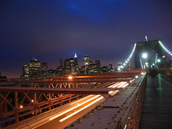 Als guten Abschluss eines gelungenen Tages geht es noch einmal zurück auf die Brooklyn Bridge, wo ich die Stadt zur blauen Stunde fotografieren möchte. Die Zeit bis dahin verbringe ich auf einer harten Bank auf der Brücke, die sogar rezeptfrei zu nutzen ist, denn die vom Verkehr auf die Bank übertragenen Vibrationen könnte man leicht als gute Rückenmassage vermarkten.