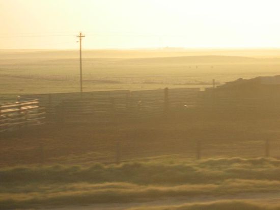Hatte ich gestern noch richtig Lust, über die Größe der landwirtschaftlich genutzten Felder in Iowa Scherze zu reißen, so bin ich von der Landwirtschaft in der hügeligen Prärie Ost-Colorados doch schwer beeindruckt. Soweit das Auge reicht eine riesige Grünfläche. Kein Baum, kaum Büsche, pure langweilig faszinierend große Felder. Alle 10 Minuten huscht mal ein feiger Zaun durchs Bild, dazwischen auch mal ein Bauernhof, meist weit hinten am Horizont, aber sonst nur grün wie unsere Signale. Kein Ort, kein Wald, noch immer kein Ort, noch immer nur grün.