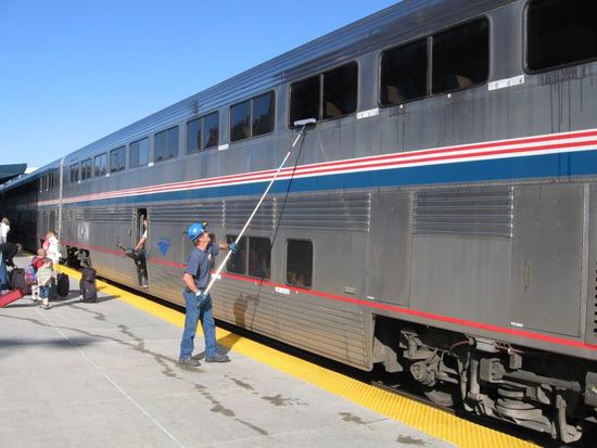 Der Bahnhof von Denver ist ein Kopfbahnhof, das heißt, wir fahren eigentlich erst daran vorbei und parken dann rückwärts ein. Wie beim Auto, nur alles etwas größer. Da sich mein Abteil im letzten Waggon des Zuges befindet, habe ich mich einfach mal an der hinteren unbenutzten Verbindungstür aufgebaut, um das Schauspiel mit anzusehen. Ein Rangierer mit Funkgerät erscheint auf der Bildfläche und weist den Lokführer ein. Ununterbrochen hält er Funkkontakt mit dem Stellwerk. "Dürfen wir noch 200 Yards?" "Bitte geben Sie uns weitere 100 Yards" Wie gut, dass die Schneckenautobahn nebenan gerade gesperrt ist, es wäre sonst peinlich geworden, von so einem Vieh überholt zu werden. Können die denn keine Signale aufstellen, dann das Ding auf grün und so lange rückwärts bis es kracht?