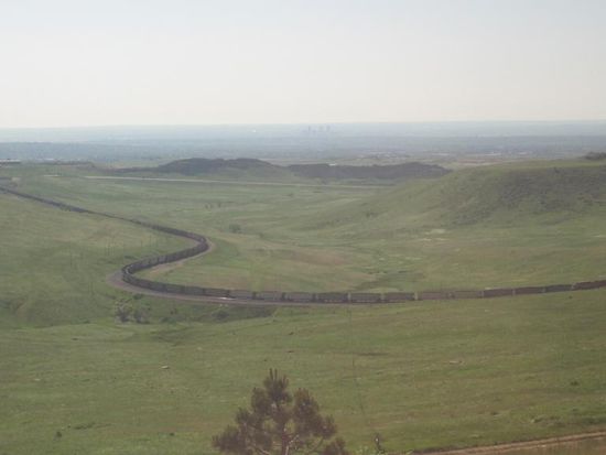 Von oben herab hat man aber auch eine schöne Aussicht. Unten in der Schleife steht noch immer der Güterzug und dahinter die weite Prärie, aus der sich in der Ferne ein paar Spitzen erheben: Denver.