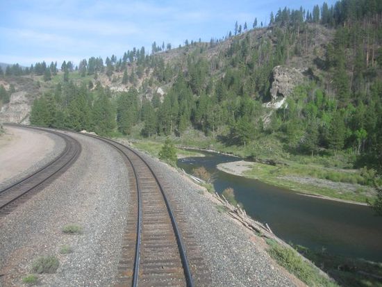 Wir werden langsamer und tragen uns scheinbar fürs nächste Schneckenrennen ein. Wir schleichen über Meilen nur so dahin. Das muss eine der bereits im Internet angekündigten Baustellen sein. Wir wurden zwar nicht, wie befürchtet, durch Wyoming umgeleitet, wahrscheinlich, weil am Memorial Day Wochenende niemand arbeitet, aber die Langsamfahrstelle macht keinen Urlaub. Die ist auch am Wochenende fleißig und zwingt alle Züge zum Schleichen.
