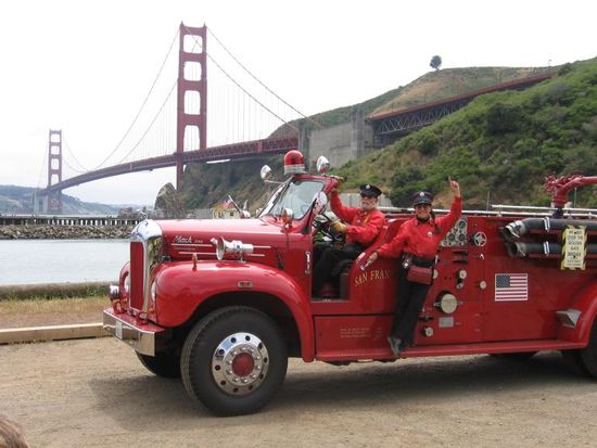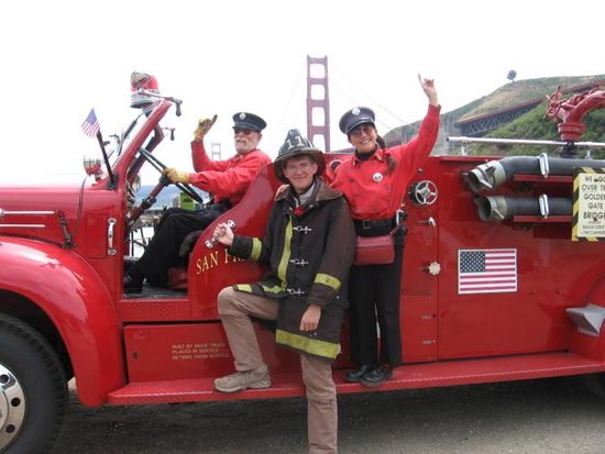 Am Nachmittag nehme ich an einer ganz besonderen Tour teil. In einem alten Feuerwehrwagen soll es über die Golden Gate Bridge gehen. Die Tour ist zwar nicht ganz billig, aber die Betreiber schlagen auch jedes Mal die Hände überm Kopf zusammen, wenn sie auf den Preis angesprochen werden. "Habt ihr eine Ahnung, wie viel Geld wir jährlich für Lizenzen zahlen müssen?" Einen historischen Feuerwehrwagen zu kaufen, warten, in Schuss halten, dann Sondergenehmigung, um damit Ausflüge machen zu können, andere Leute mitzunehmen, ihn in Feuerwehrfarben gestrichen zu lassen, Sondergenehmigungen, um die Sirene nicht entfernen zu müssen - von der Wiege bis zur Bare, Formulare, Formulare.