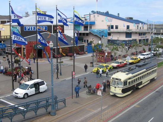 Hier am Ende von Pier 39 befindet sich auch ein Bubba Gump Shrimp Restaurant. Inspiriert durch den Film Forrest Gump wurde diese Restaurantkette 1996 eröffnet (der Film ist von 1994). Wer sich einmal wie der Millionär des Films fühlen möchte, kann sich etwas versteckt auf der oberen Etage vor dem Restaurant auf eine Bank setzen, seine Füße in die Schuhe von Forrest Gump stecken und mit dem berühmten Koffer, aus denen Forrest seine Pralinenschachtel zaubert, fotografieren lassen.