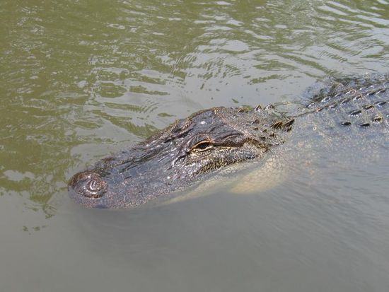 Ok, Schildkröten sind abgehakt, können wir wieder 2 Meter fahren. Alligator auf 11 Uhr (haben die alle keine Uhr?). Ja, und da Alligatoren interessanter sind als Schildkröten, halten wir uns bei diesem Kerlchen etwas länger auf. Damit ihn jeder bestaunen kann, ohne das Boot zu kippen, wirft unser Kapitän eine Marshmallow-Spur ins Wasser, um den Alligator rund um das Boot zu locken. "Wir füttern sie mit Marshmallows, da die Alligatoren diese nicht riechen können und somit nicht wissen, dass wir noch viel mehr davon an Bord haben. Wir könnten ihn auch mit Hühnchen füttern, doch wenn er den Geruch in der Nase hat, würde er auch ins Boot kommen. Und das ist zu gefährlich, daher bleiben wir bei Marshmallows. Alligatoren können nämlich unheimlich hoch springen. So lange man ihren Schwanz sieht, ist alles in Ordnung, aber sobald der untertaucht und damit ausholt, sollte man nicht in seiner Nähe sein. Das sind wahre Fressmaschinen. Die tun den ganzen Tag nichts anderes als fressen. Ihre Beute lokalisieren sie hauptsächlich, indem sie kleinste Erschütterungen auf dem Wasser registrieren. Passt mal auf..."