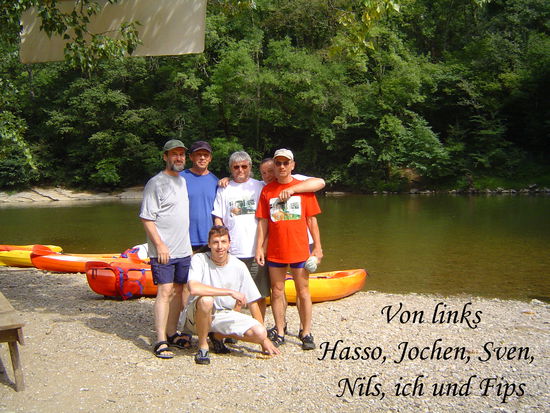 Nils, Feuerwehrmann, Exmatrose, Hektiker, Bluesfreak und aktiver Kampfsportler. Außerdem auf unseren Fahrten Koch ehrenhalber mit nur einem Nachteil, er bereitet fast alles praktisch fettfrei, dafür aber, sagen wir mal, knoblauchmäßig zu. Im übrigen einer der besten Freunde, die man haben kann. Fips unser Bergfex, der bedingt durch seinen Job im Schichtsystem viel Freizeit in der Woche hat, die er ausnahmslos in der Sächsischen Schweiz verbringt. Klettert noch immer im oberen Bereich, alle Achtung.. Manchmal ist er mir einfach zu schnell, schaut nie nach rechts oder links und trotzdem, ich mag ihn, zumal er mich schon öfters mit "sanftem Druck", wenn ich aufgeben wollte die Felsen raufgezogen hat.Ein Beispiel dafür ist die sogenannte "Stefanklemme", ich verrate aber nicht wo die ist. Jochen, das genaue Gegenteil, der ruhende Pol der Gruppe. Sein Lieblingssatz: "Jetzt kochen wir erst mal 'nen Kaffee". Hochspannungsmonteur, seit Ewigkeiten auf Montage, ihm würde ich mich jederzeit anvertrauen. Schließlich Sven, mein ältester Sohn, zu dem ich in den letzten Jahren leider wenig Kontakt hatte. Ich glaube die Woche war für uns beide eine ungeheure Bereicherung. Danke dafür. Ja und ich selber? Das sollten eigentlich andere beantworten, nur soviel, ich bin Zwilling und glaube, das die Charakteristika dieses Sternbildes nach mir geschrieben worden sind. An dieser Stelle einen herzlichen Gruß an Dr. Tomaschewski aus Freital, der mich letztes Jahr nach meiner Rückenwirbelfraktur operiert hat und dem ich es verdanke, das ich überhaupt wieder im Boot sitzen darf.