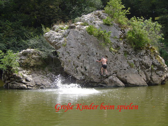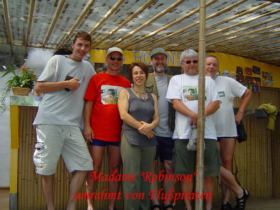 Aber nun zurück zum Aveyron. Gleich hinter der Stadt ein Rundbogenwehr mit nur einer kleinen Durchfahrt, auch mehr schlecht als recht, in der Flussmitte. Aber genau dort hat sich ein Angler mit mürrischem Gesichtsausdruck postiert. Also schieben wir die Boote über die Wehrkrone und rutschen hinunter. Etwa 2 km ruhige Fahrt ohne große Strömung liegen hinter uns als das nächste Wehr auftaucht. Ganz links eine schöne lange und steile Bootsrutsche, danach eine kleine Slalomstrecke. Der Fluss gibt sich nun lebhafter, das bis dahin breite Tal verengt sich zur Schlucht. Die Ufer sind übersät mit riesigen, vom Wasser glattgeschliffenen Steinplatten, die zum Sonnenbaden einladen, dazwischen feiner Sandstrand und Wiesen. Und dann sehe ich vor mir die hohen Felsen aufragen und weiß, dort macht der Aveyron einen Bogen nach rechts. Wir sind bei "Robinsons" angekommen. Letztes Jahr hatte Fips ein Foto gemacht auf dem wir drei zusammen mit Madame "Robinson", also "Freitag" zu sehen sind. Er hat T-Shirts mit diesem Foto bedruckt, die wir natürlich an diesem Tage getragen hatten. Ankommen, die Boote an Land ziehen und die Stufen zur Felsengrotte, pardon zur "Touristic Bar Robinson" emporsteigen sind eins. Als Madame "Freitag" uns sieht stutzt Sie, aber nach ungefähr 10 Sekunden ist die Erinnerung da. Wir werden herzlich begrüßt und verbringen den Nachmittag mit faulenzen, Kaffee und Bier trinken, von Madame zubereiteten Crepes essen und tollkühnen Sprüngen von einem Felsen, der mitten im Fluss liegt und immerhin etwa 8 m aus dem Wasser ragt, verbracht werden.