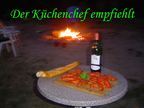 Am frühen Nachmittag dann Ankunft im" Camp l' Alternative" am Tarn. Alles noch genau wie im letzten Jahr, Bootsverleih, Klettergarten, Boulderfelsen und Monsieur, der uns gleich wiedererkannte und nichts dagegen hatte, das wir auf seinem Gelände nächtigen. Zum Abendessen gab es eine Delikatesse, selbstgefangene Flusskrebse. Die Tarnkrebse waren außergewöhnlich groß und die Zubereitung ist relativ einfach. In einem ausreichend großen Kessel Wasser zum sieden bringen, die Krebse hineinschütten und einige Minuten kochen lassen bis sie an die Oberfläche treiben. Sie sind dann ganz rot und gar. Bon Appetit.