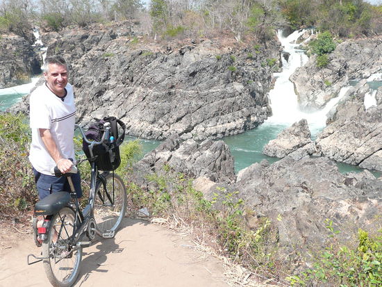 Aufsitzen und abfahren Richtung Franzoesische Bruecke, einzigste laotische verrostete Eisenbahn un den maechtigen Mekong-Wasserfaellen.