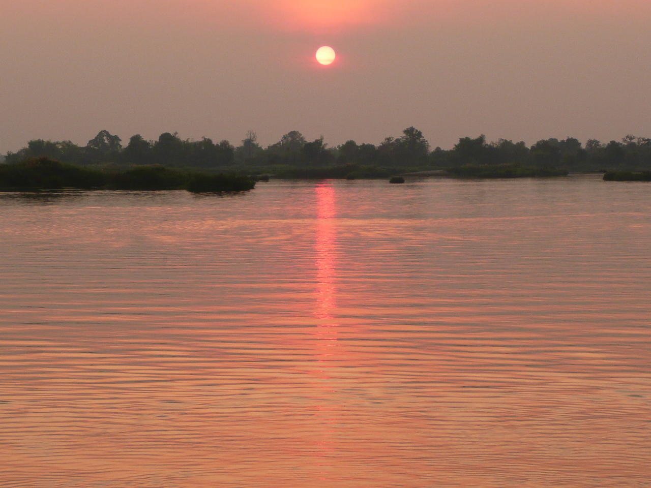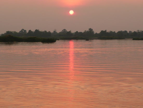 Um den Sonnenuntergang zu erleben, muessen wir gar nicht weit laufen, der spielt sich naemlich vor unserer Bungalow-Tuere ab. Wunderbar. Blutrot tauchte sie in den Mekong ab.