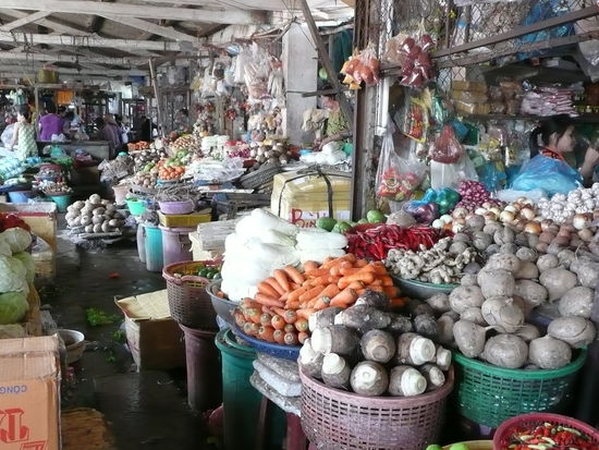 Auf dem Markt an der Ngo Quyen hinter der Bruecke in die Innenstadt links. Dort herrscht reges Treiben. Mit seinen Obst-, Blumen- und Fischstaenden ist er sehr fotogen, allerdings ist die Strasse nicht gleich aufzufinden. Mit unserem "Ohne Woerter-Buch" von Langenscheid mit 500 Zeigebildern, fragen wir uns durch. Wir zeigen auf Fisch und Flasche mit Sauce und schnell sind wir am Ziel angekommen.