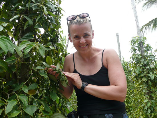 Tatsaechlich finden wir endlich den Platz aller Plaetze, jeder wurde im Leben schon mal dort hingeschickt. Dort wo der Pfeffer waechst! Unscheinbar am Strassenrand, eingebettet zwischen Palmen und Straeuchern stehen 3 m hohe Pfaehle, an denen sich die Pflanzen emporranken. Der Besitzer entdeckt uns, heisst uns willkommen und laed uns spontan zum Tee ein.