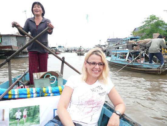 06:30 Uhr haben wir mit dem privaten Bootsfahrer ausgemacht, dass er uns am Hotel abholt. Zu Fuss sind es nur ein paar Minuten zum "Hafen" (Preis 350.000 Dong = ca. 18 EUR). Dort wartet bereits das Sampans mit der Ruderfrau auf uns. Sie hat die typischen scherenartigen Ruder auf ihrem Boot. Wir fahren zwei schwimmende Maerkte an Cai Rang und Phong Dien, danach soll es noch durch die Seitenkanaele gehen.