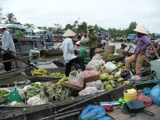 Die Ruderfrau schmeisst den Aussenmotor an und tuk-tuk-tuk schippern wir davon. Am Ufer ein Haus auf Holzpfaehlen neben dem anderen. Teilweise haben sie bedrohliche Schieflage und dennoch sind sie bewohnt. Frauen waschen Kleidung im Mekong, manche halten im Zaun Enten und Gaense, andere gaertnern, pflanzen Salat und Kraeuter an. Nach den 7 km Wasserstrasse erreichen wir den schwimmenden Markt Cai Rang. Wir sind entsprechend frueh dran und es wimmelt von Sampans, deren Ruderfrauen und -maenner aufrecht auf ihren Booten stehen, um einen guten Druckpunkt fuer ihre scherenartigen Ruder zu haben. Mit auf dem Wasser uralte mit Waren voll gestopfte Logger. Unglaublich, was hier los ist! Gut sichtbar an einem Bambusmast im Bug ein Muster seines Produktangebots. Hier ist alles zu bekommen. Laut Reisefuehrer angefangen vom Haarschnitt bis zum Sarg, den Loewenanteil der Waren stellt jedoch Obst und Gemuese dar.