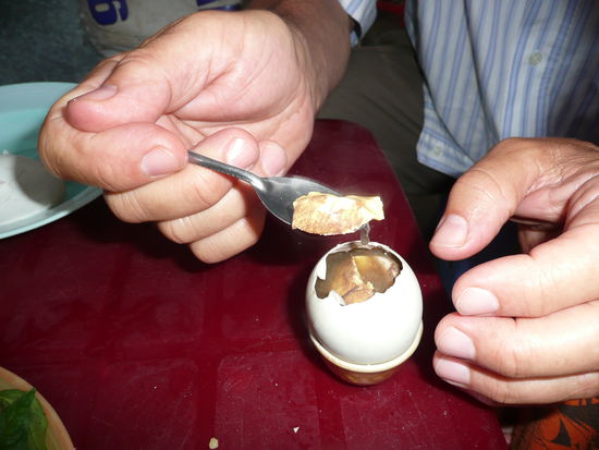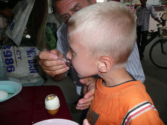 Beim Durchschlendern durch die Strassen kommen wir auch vorbei an einem Essensstand mit angebruehteten Huehnereiern. Paul: ich moechte das probieren!!!! Okay, bestellen wir eins. Serviert wird das gekochte Ei mit Pfeffer und Salz, Kraeutern und Lemone. Manfred klopft es vorsichtig auf und laesst Paul probieren, er spuckt es aber gleich wieder aus. ICH - nein Danke...doch das nicht!!!