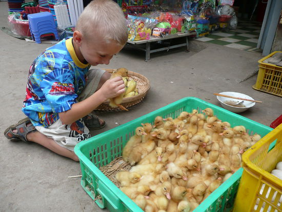 Bei den Entenkueken mussten wir Paul loseisen, er wollte gar nicht mehr weg, hat sogar geschmust mit den Kuecken und wollte alle kaufen.