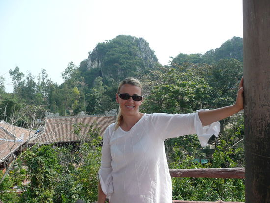 Von allen Seiten sind wir umgeben von zerkluefteten Marmorfelsen. Wir machen uns auf Besichtigungstour durch die zahlreichen Hoehlen und Pagoden.