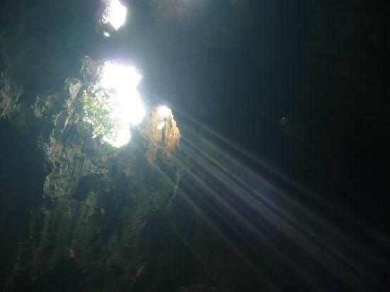 Treppenstufen hinunter in das unheimliche von Raeucherstaebchen durchdrungene Halbdunkel der Huyen Khong-Hoehle. Geradeaus am Ende der 30 m hohen Grotte befindet sich ein grosser, sitzender Buddha. Das Interessanteste neben den zahlreichen Altaeren, Schreinen und Tempelwaechtern an der Hoehle ist ihre Decke, durch die jetzt am fruehen Mittag die Sonnenstrahlen wie Scheinwerfer eindringen. Ein herrliches Schauspiel der Natur!