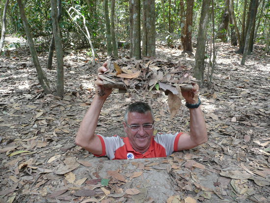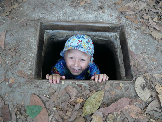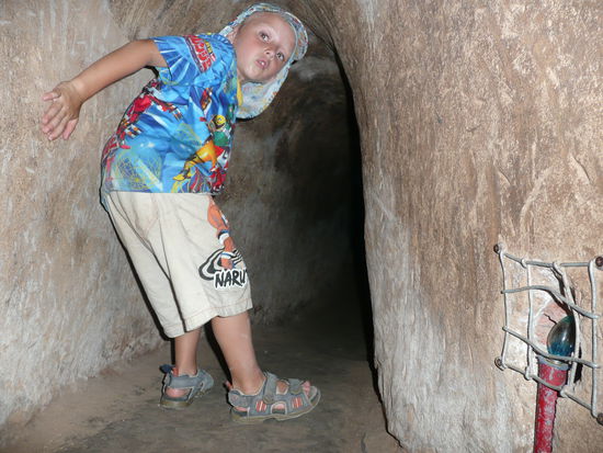 Kueche, Besprechungsraeume, Schlafraeume, Gemeinschaftsraeume, Krankenstation, Toilettenanlage, alles auf 250 km Laenge verteilt. Ein ausgekluegeltes System, mit Lueftungsanlagen und Rauchabzug. In einige nachgebaute Raeume laufen wir hinein (diese sind nicht unterirdisch). Bevor wir in die Tunnel kriechen, laufen wir an Bomenkratern von B52-Bombern, Schuetzengraeben und einer Kueche vorbei. Der Rauch vom Ofen wurde hunderte von Metern weiter, verdeckt an die Oberflaeche geleitet, um die B52-Bomber zu taeuschen und die Mannschaft nicht in Gefahr zu bringen.